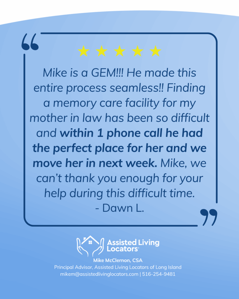 I’ve toured over 90 senior living communities across Nassau, Suffolk, and Queens. I know what they offer beyond the brochures and I help families avoid the common pitfalls of going it alone.